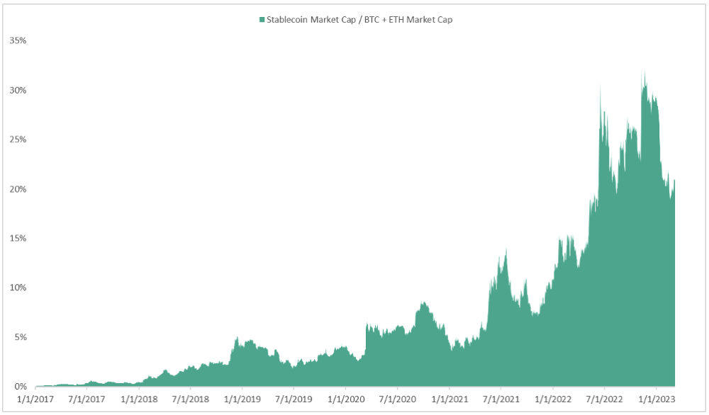 Рисунок 2: Рыночная капитализация стейблкоина в процентах от рыночной капитализации BTC + ETH. Источник: Coinmetrics, Grayscale Research, рыночная капитализация стейблкоинов состоит из USDT, USDC, BUSD, DAI, GUSD, HUSD, PAX, SAI, TUSD и USDK, данные по состоянию на 09.03.23.
