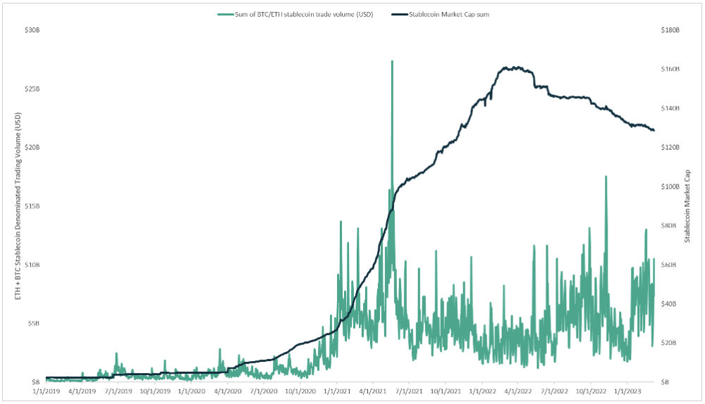 Рисунок 3: Рыночная капитализация стейблкоина в сравнении с объемом торгов BTC/ETH.Источник: Coingecko, Grayscale Research, по состоянию на 11.03.2023.