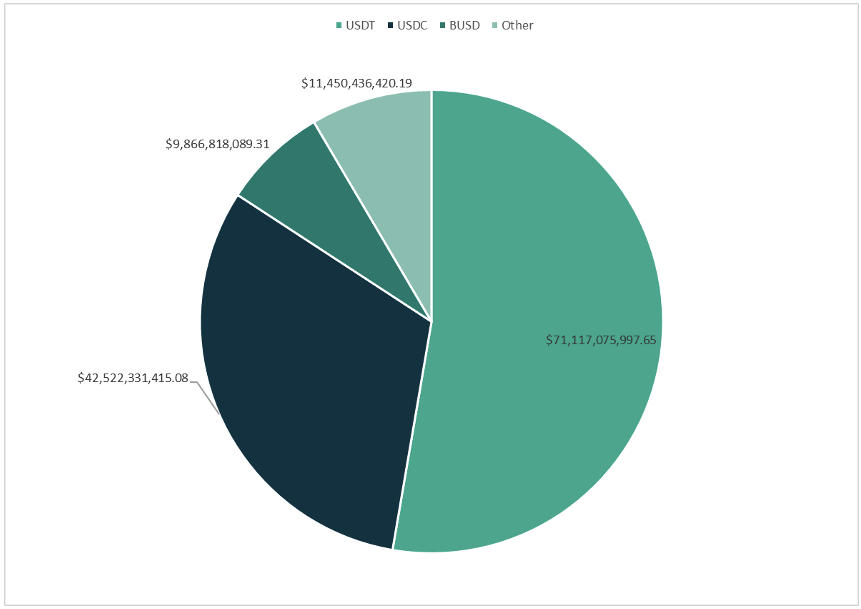 Стейблкоины, обеспеченные активами, проще всего понять, так как они обеспечены 1 к 1 традиционными активами, такими как наличные деньги, их эквиваленты, казначейские обязательства и так далее, хотя существуют проблемы с прозрачностью, связанные с трудными для аудита банковскими счетами. Более 90% рыночной капитализации стейблкоинов в настоящее время составляют стейблкоины, обеспеченные активами, такие как USDT, Binance USD (BUSD) и USDC (рис. 6).