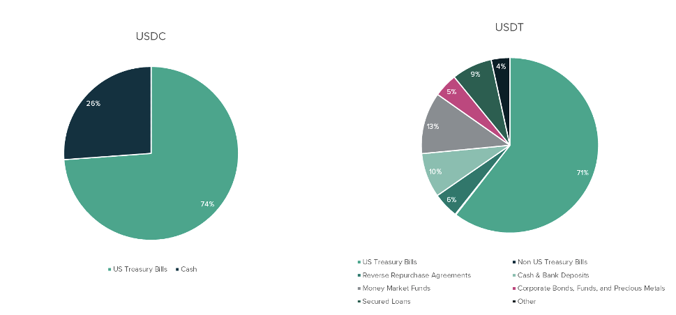 Рисунок 7: Разбивка резервов USDT и USDC. Источник: Grayscale Research, Tether (по состоянию на 31.12.2022), Center (по состоянию на 02.03.2023).