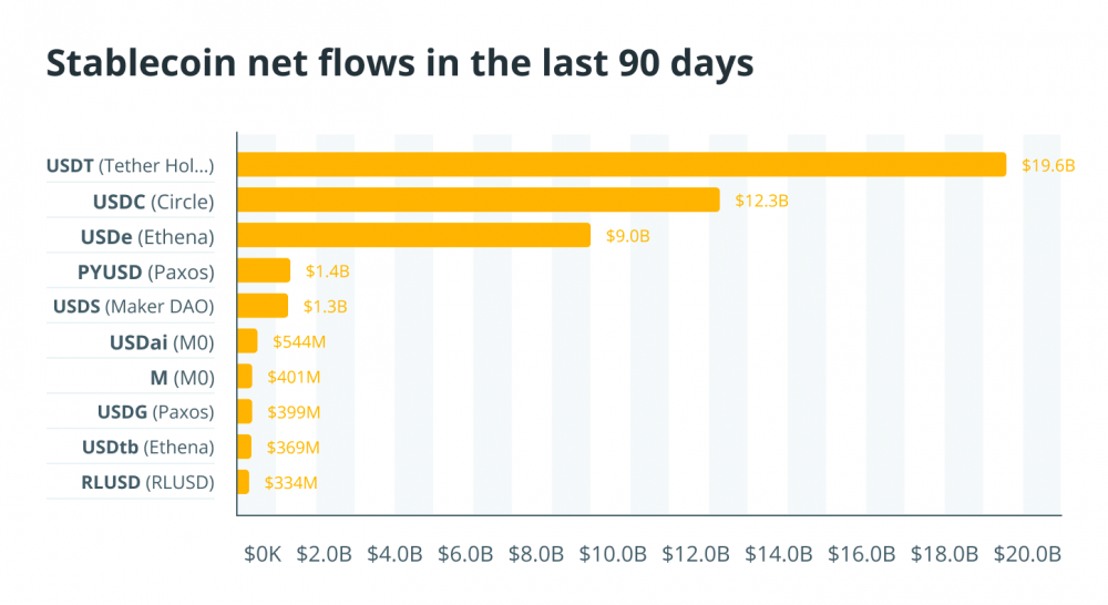 За пределами тройки лидеров, USD PayPal и USDS Sky зафиксировали около 1 400 000 000 и 1 300 000 000 долларов квартального притока соответственно. Новые участники рынка, такие как RLUSD от Ripple и USDtb от Ethena, также зафиксировали меньший, но устойчивый рост с низкой базы.