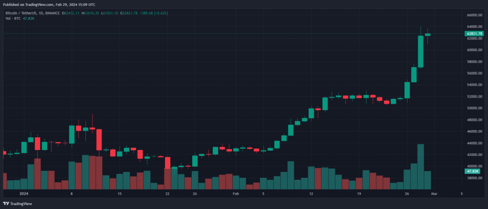 Биткоин преодолел отметку в 60 000 долларов впервые более чем за два года 28 февраля, за 47 дней до халвинга, и вырос на 30% за прошедшую неделю.