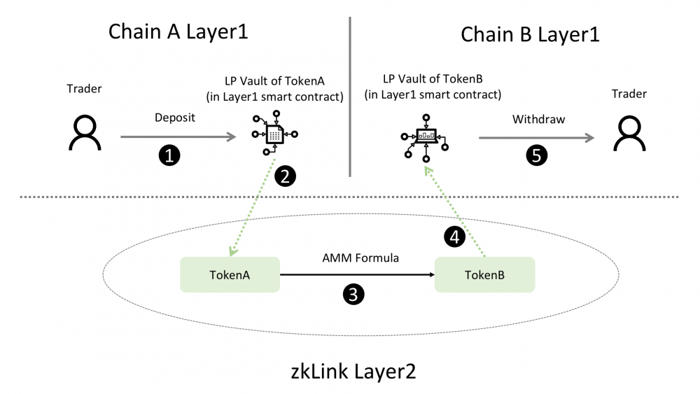 Шаг 3 на рисунке разработан в мультичейновом ZK-свернутом и мультичейновом AMM. На шаге 2 Layer1_Watcher в сети zkLink Layer2 постоянно отслеживает журналы смарт-контрактов Layer1 и синхронизирует параметры каждой транзакции с механизмом Layer2 для вычислений. Аналогичным образом на шаге 4 отправитель Layer1_Sender передает проверенный результат контракту Layer1 в соответствующем блокчейне, который затем передает нужные токены трейдеру. Вот как контракт zkLink Layer2 получает и отправляет информацию из/в разные смарт-контракты Layer1.