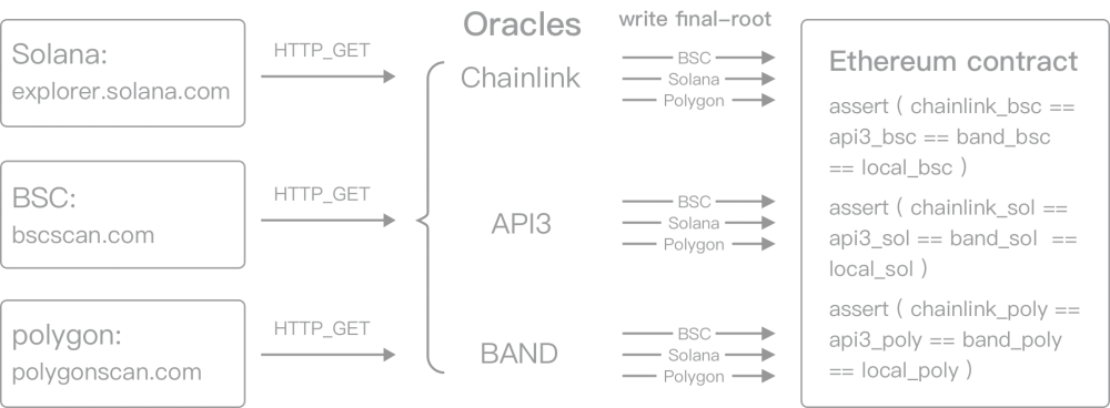 Таким образом, в настоящее время проблема проверки становится сравнением того, являются ли два или более final_root из каждого блокчейна согласованными или нет (нет необходимости проверять каждую деталь огромного количества данных транзакции). Этот процесс достаточно прост, чтобы его мог выполнить каждый, что позволяет легкой сети оракулов сравнивать final_roots.