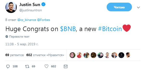 «Огромные поздравления BNB, это новый биткоин», - подчеркнул Сан.
