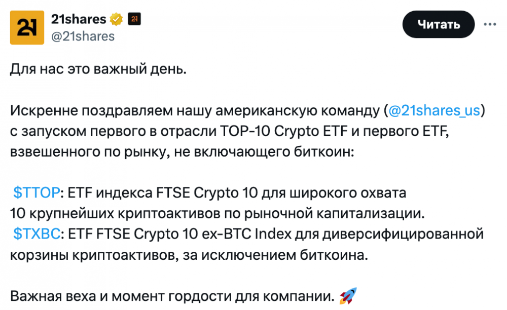 Новые продукты — 21Shares FTSE Crypto 10 Index ETF (TTOP) и 21Shares FTSE Crypto 10 ex-BTC Index ETF (TXBC) — были представлены в четверг. Оба фонда предлагают широкую экспозицию к цифровым активам через отслеживание криптовалютных индексов FTSE Russell. Они владеют корзиной ведущих криптоактивов по рыночной капитализации вместо инвестиций в отдельный токен.