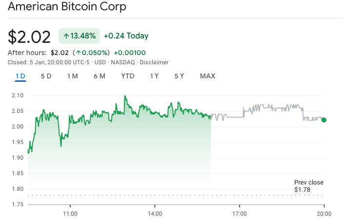 American Bitcoin, связанная с Трампом, стала самым эффективным американским майнером криптовалют в понедельник. Источник: Google Finance