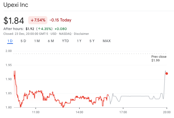 Во вторник акции Upexi (UPXI) закрылись с падением на 7,54% до $1,84. Однако после закрытия торгов наблюдалось небольшое восстановление: цена выросла на 4,34% до $1,92.