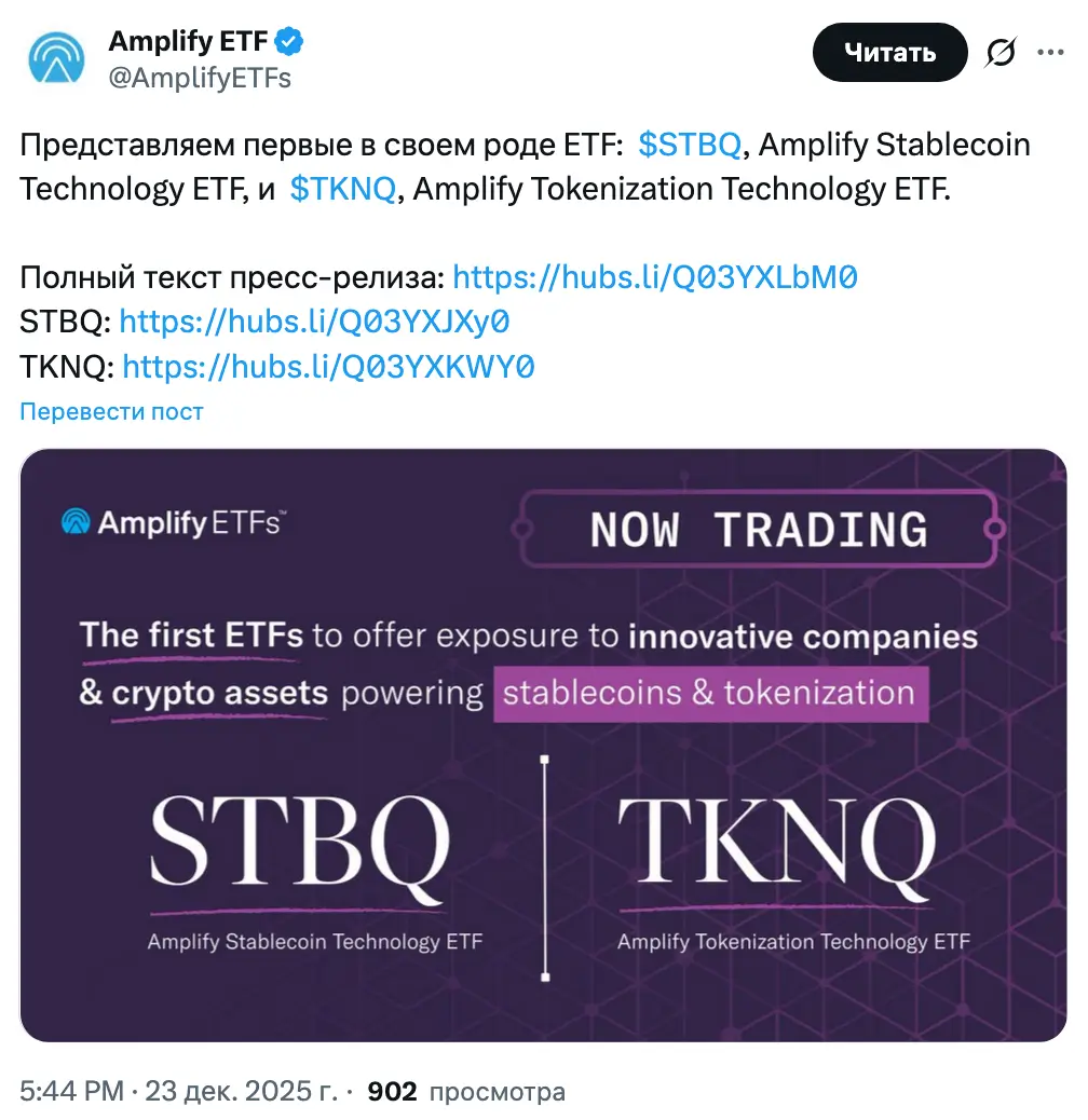 Во вторник компания сообщила, что ее фонды Amplify Stablecoin Technology ETF (STBQ) и Amplify Tokenization Technology ETF (TKNQ) начали торги на бирже NYSE Arca.