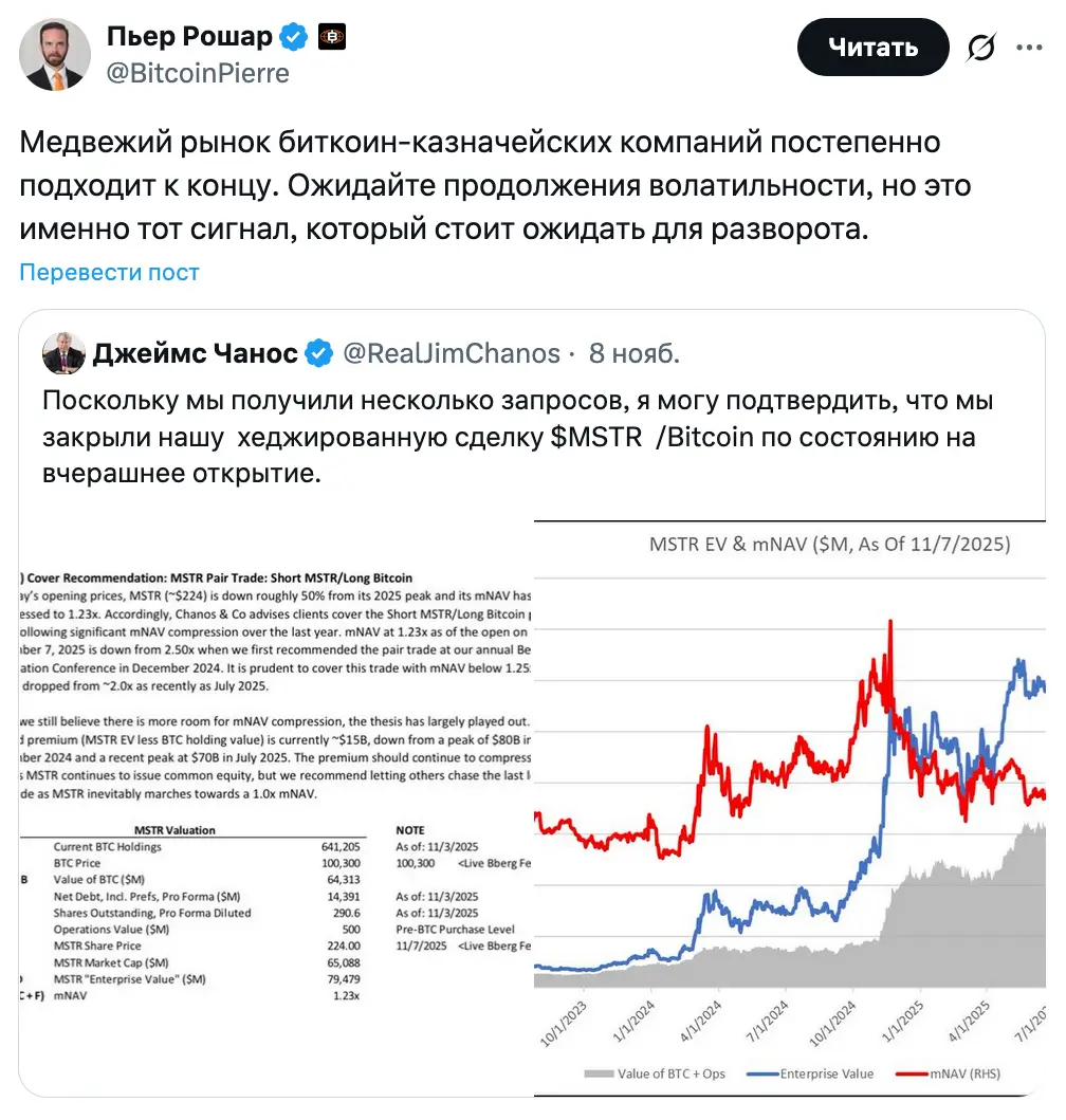 Генеральный директор The Bitcoin Bond Company Пьер Рошар в ответ заявил, что медвежий рынок для акций компаний с биткоин-казнами постепенно подходит к концу. Чэнос отметил, что акции Strategy упали примерно на 50% с максимума 2025 года, а коэффициент mNAV компании снизился до 1.23x. Он написал в записке, что благоразумно закрыть эту сделку при mNAV ниже 1.25x, учитывая падение с примерно 2.0x еще в июле 2025 года.