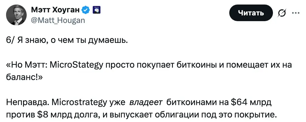 «MicroStrategy уже владеет биткоинами на $64 млрд при долге в $8 млрд и выпускает долговые обязательства под эту позицию. Сложно иметь $56 млрд в биткоин-капитале. Попробуйте привлечь $56 млрд в виде акционерного капитала для покупки биткоина в корпоративной структуре без долгов. Это непростая задача», — заявил он.