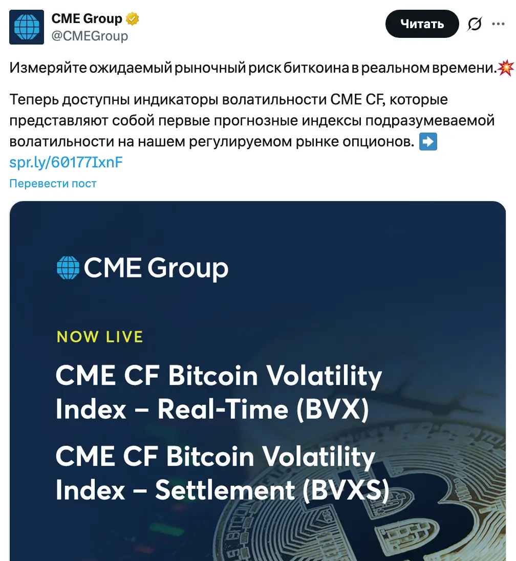 Особое внимание привлекает индекс волатильности CME CF Bitcoin Volatility Benchmarks. Он отслеживает подразумеваемую волатильность опционов на биткоин‑фьючерсы и микро‑биткоин‑фьючерсы. По сути это аналог индекса VIX на рынке акций: он показывает, насколько сильные колебания цены ожидают трейдеры в ближайшие 30 дней.