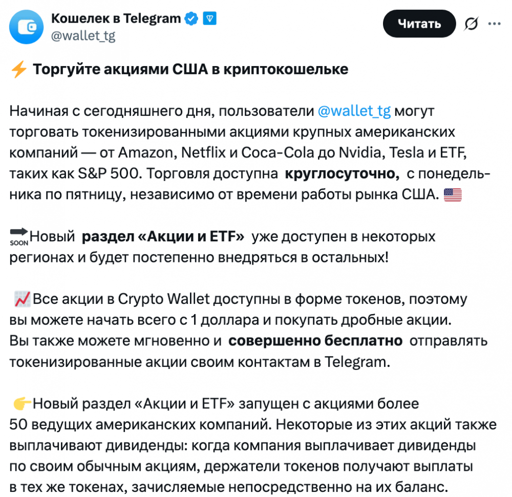 Согласно анонсу в понедельник, Wallet in Telegram начал предлагать токенизированные акции 50 компаний и ETF, некоторые из которых выплачивают дивиденды.