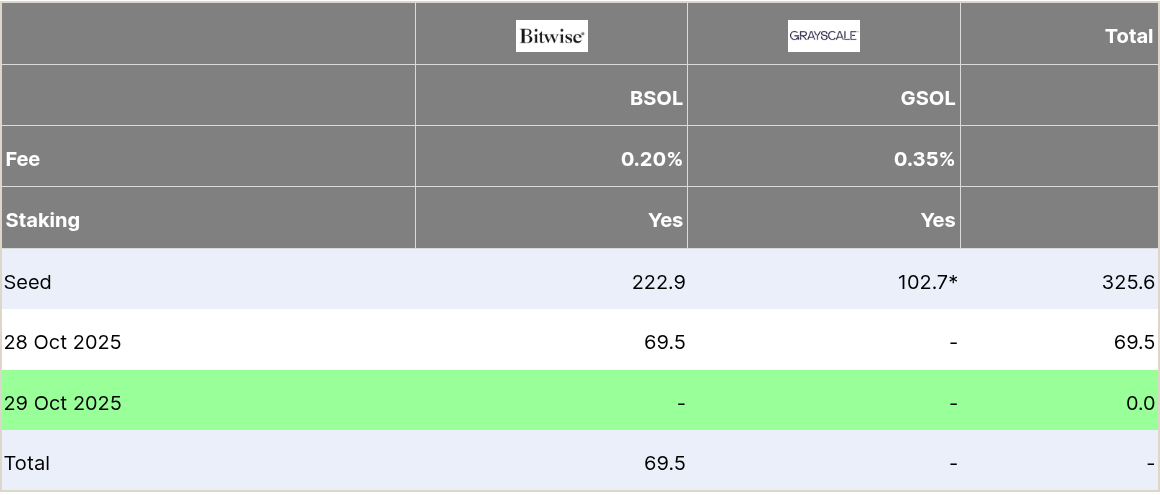 Согласно данным Farside Investors, рынок Solana ETF в США в настоящее время включает только два продукта — от Bitwise и Grayscale. Вместе они привлекли $325,6 млн начального капитала, при этом Bitwise добавил $69,5 млн притока в первый день торгов.