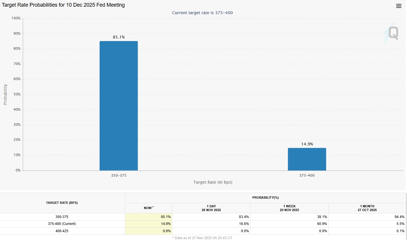 По данным инструмента FedWatch от CME Group, рынки оценивают вероятность снижения процентной ставки на 25 базисных пунктов в 85%, в то время как неделю назад она составляла 39%.