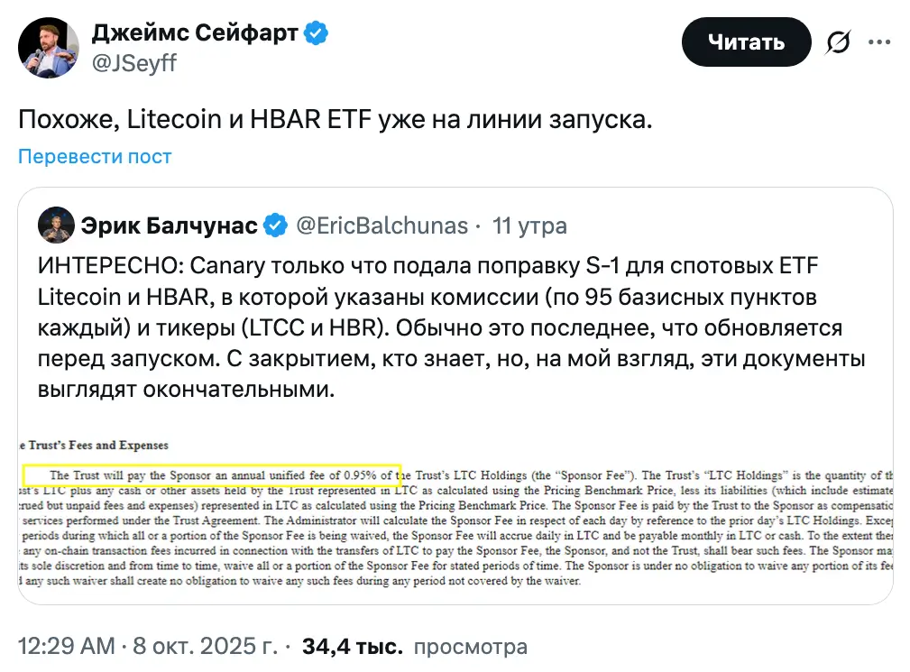 Еще один аналитик Bloomberg ETF Джеймс Сейфарт также считает, что поправки — хороший знак того, что одобрение состоится. Он говорит, что «похоже, что Litecoin и HBAR ETF уже на грани завершения».