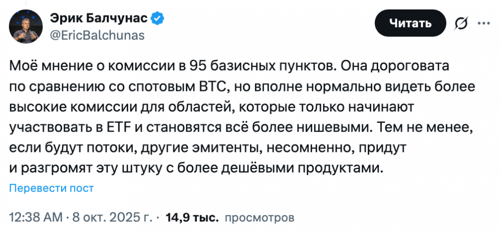 «Мое мнение о комиссии в 95 базисных пунктов. Она дороговата по сравнению со спотовыми BTC ETF, но вполне нормально видеть более высокие комиссии для областей, которые только начинают участвовать в ETF и становятся все более нишевыми», — сказал он.