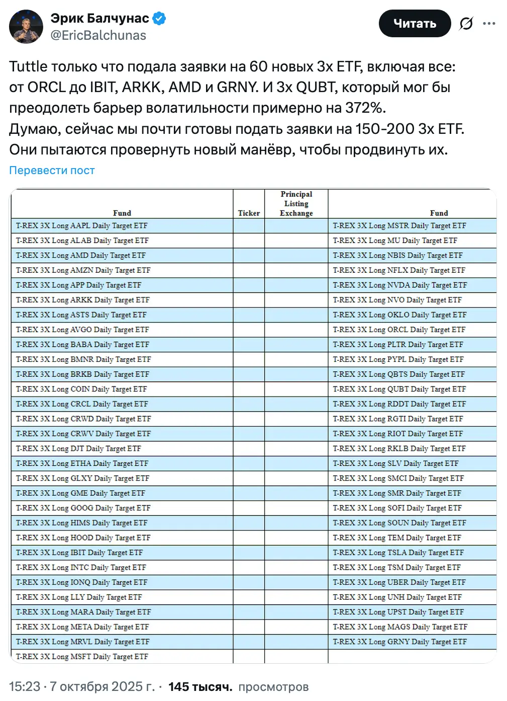 По словам Балчунаса и Сейфарта, правительство США, возможно, и приостановило свою деятельность, но компании продолжают подавать заявки на новые ETF. Особое внимание уделяется фондам с 3x кредитным плечом.