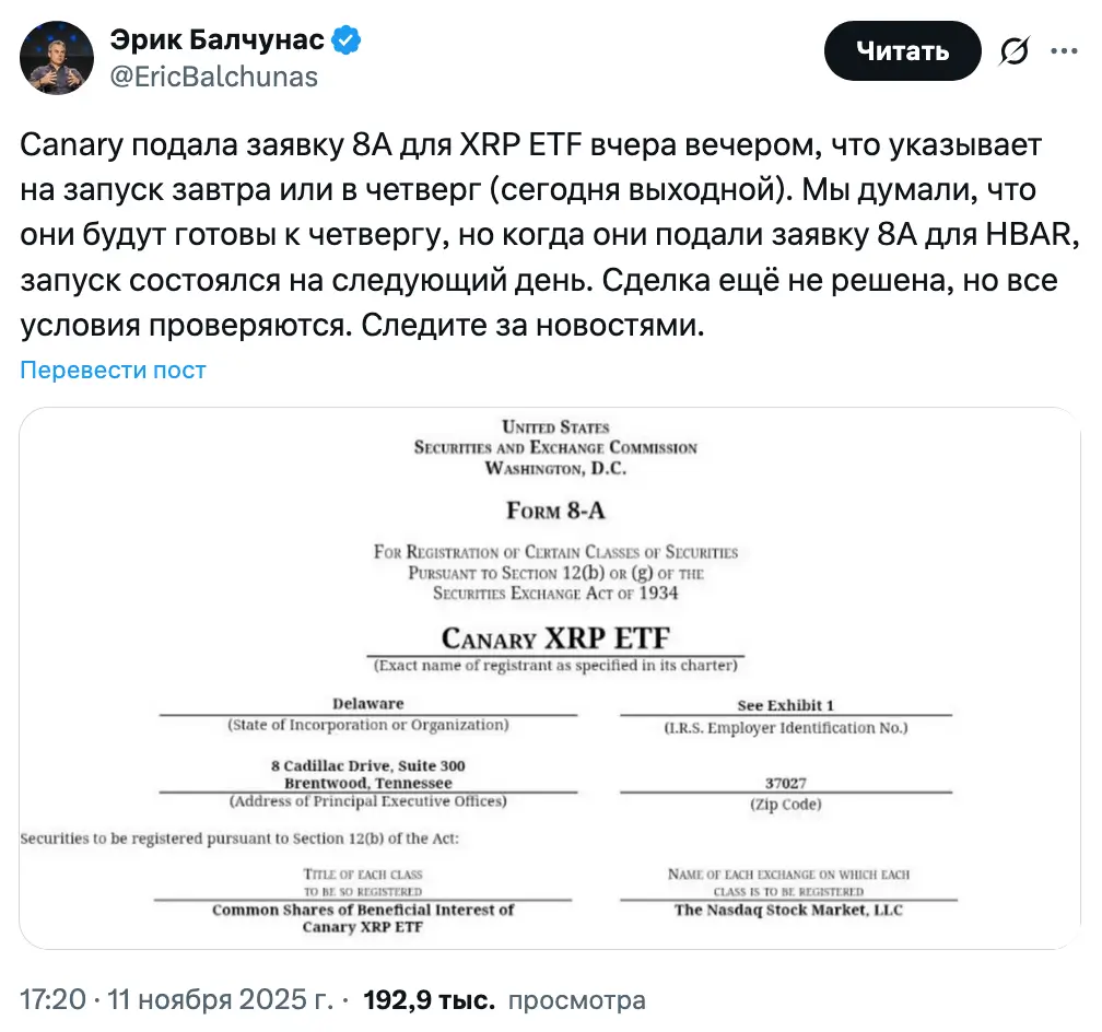 Балчунас заявил, что подача документов «указывает на запуск в среду или четверг», поскольку подача форм 8A для ETF на Hedera привела к запуску этих фондов на следующий день.