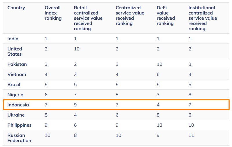 Индонезия займет 7-е место по уровню внедрения криптовалют в 2025 году. Источник: Chainalysis.