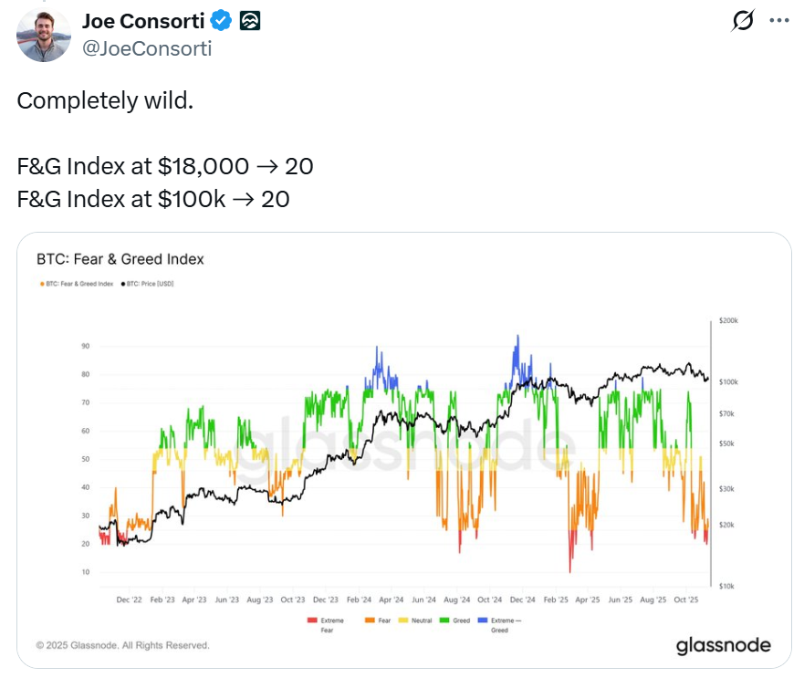 Джо Консорти, руководитель отдела роста биткоина в протоколе торговли и ликвидности Horizon, заявил, что общие настроения трейдеров находятся на том же уровне, что и в 2022 году, когда биткоин стоил около 18 000 долларов, ссылаясь на данные Glassnode.