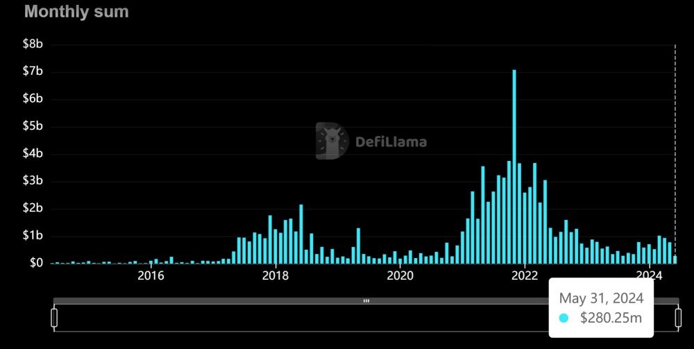 Данные, полученные от агрегатора TVL DefiLlama, показывают, что по состоянию на 16 июня 2024 года общий объем финансирования криптовалютной индустрии составляет 101,35 миллиарда долларов. Еще в мае 2014 года, всего через пять лет после создания Биткоина (и еще через год до запуска Ethereum), первый месяц зарегистрированного финансирования криптовалютных стартапов составил сравнительно ничтожные 17,14 миллиона долларов.