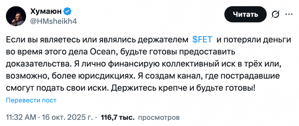 Шейх пообещал финансировать коллективные иски в трех или более юрисдикциях и призвал Binance, GSR и ExaGroup провести расследование. Он также обратился к держателям токенов FET с призывом подготовить доказательства против Ocean Protocol, пообещав создать канал для подачи исковых заявлений.