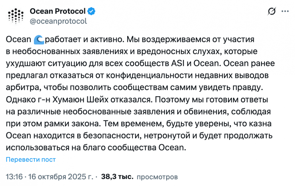 Ocean Protocol ответил в X, полностью отвергнув обвинения и назвав их «необоснованными утверждениями и вредоносными слухами».