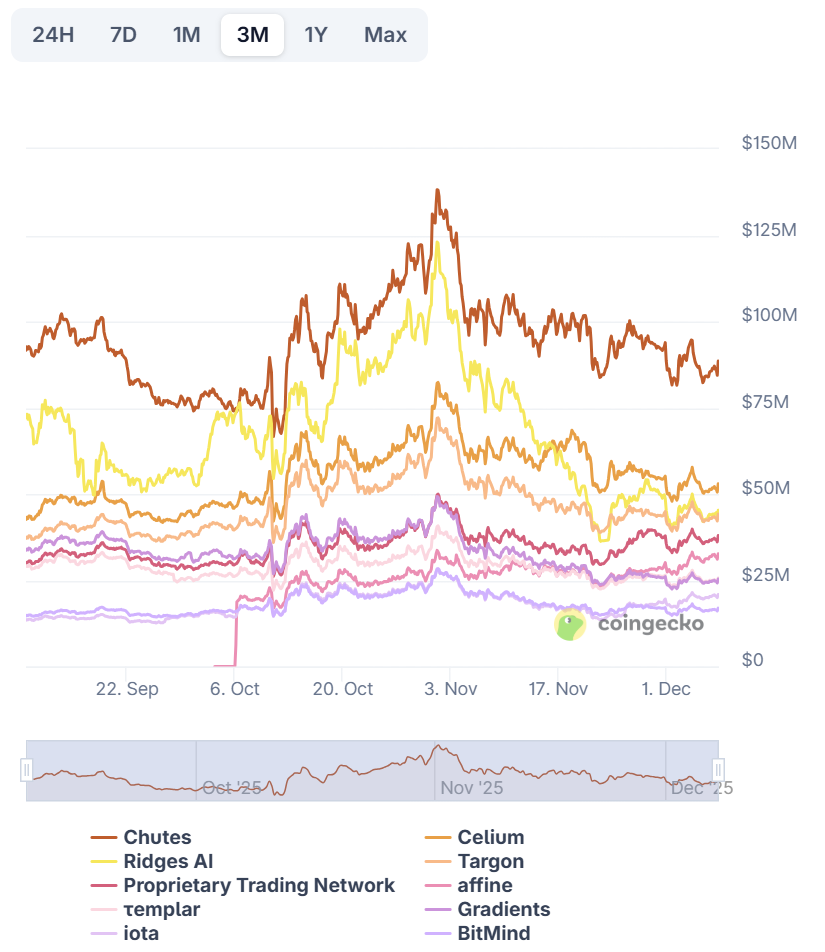 В любом случае, по данным Grayscale Research, стоимость подсетей значительно выросла с момента запуска. Крупнейшими из них являются Chutes, предоставляющий бессерверные вычисления для моделей ИИ, и Ridges, подсеть, ориентированная на краудсорсинг разработки агентов ИИ.
