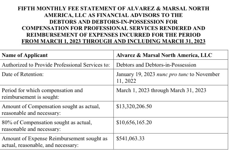 Alvarez & Marsal выставила FTX счет на 13,8 млн долларов за март. Источник: Кролл
