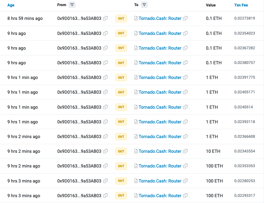 Недавние действия кошелька-эксплойтера LendHub. Хакеры отправили средства в Tornado Cash партиями по 100 ETH, а затем перешли на более мелкие депозиты. Источник: Etherscan.