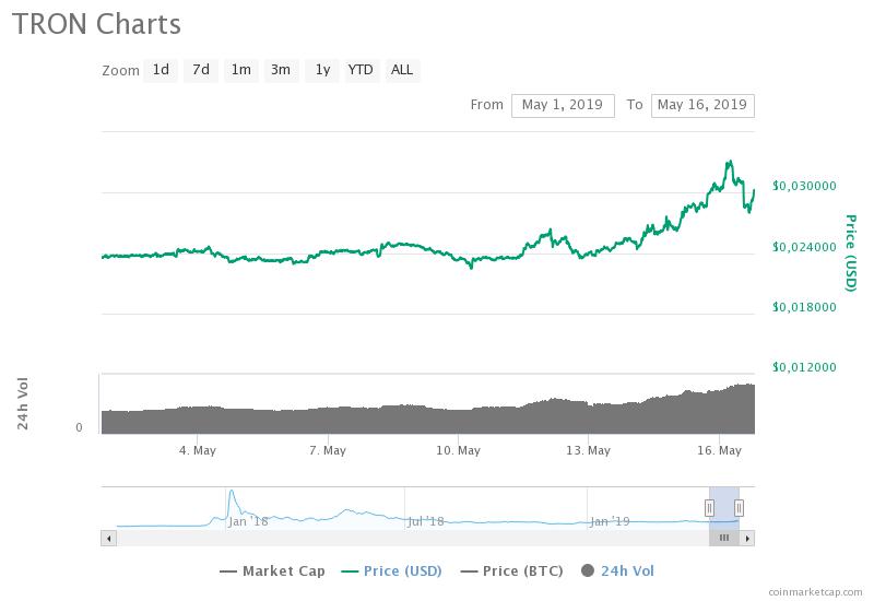 Курс токена Tron (TRX) резко потерял в цене 16 мая несмотря на позитивные новости от Opera.