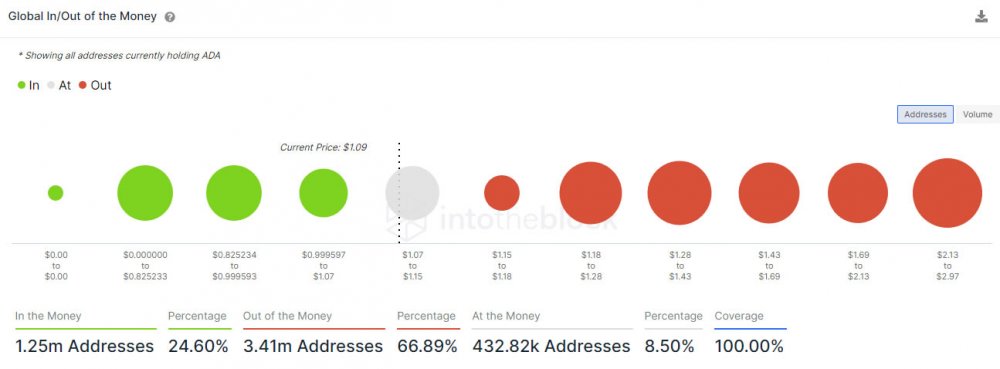 Согласно индикатору IntoTheBlock «в деньгах/без денег», более двух третей, или 67% держателей ADA, терпят убытки. Четверть инвесторов Cardano находятся в плюсе, а 9% из них находятся в точке безубыточности.