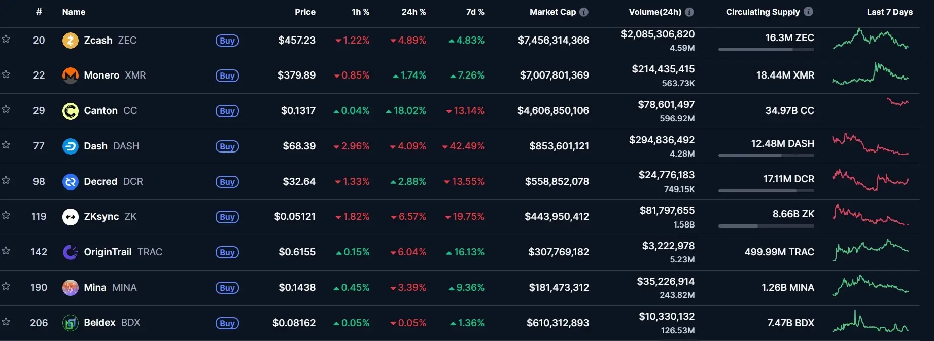 Несмотря на недавнее падение, Zcash остается ключевым игроком в нарративе приватных монет с рыночной капитализацией $7,4 млрд.