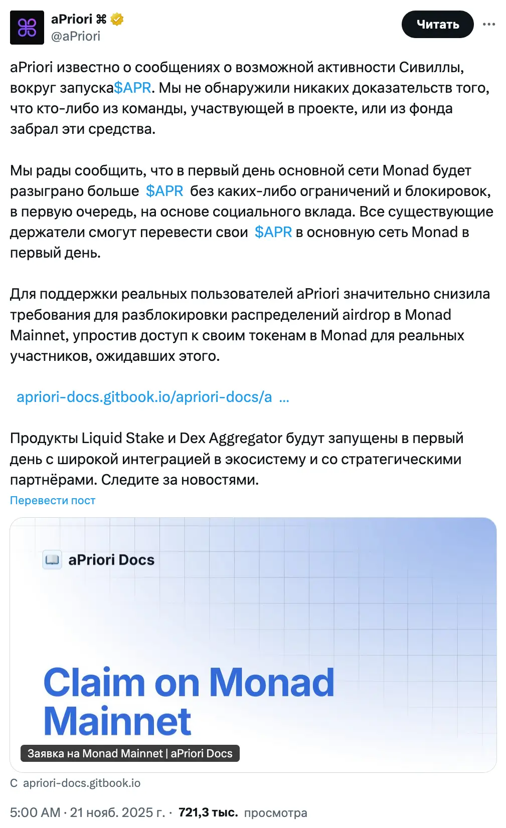 aPriori снизила требования к участию в аирдропе для сети Monad Mainnet, чтобы поощрить реальных пользователей, но в пятницу сообщила об отсутствии доказательств получения аирдропа кем-либо из команды или фонда.