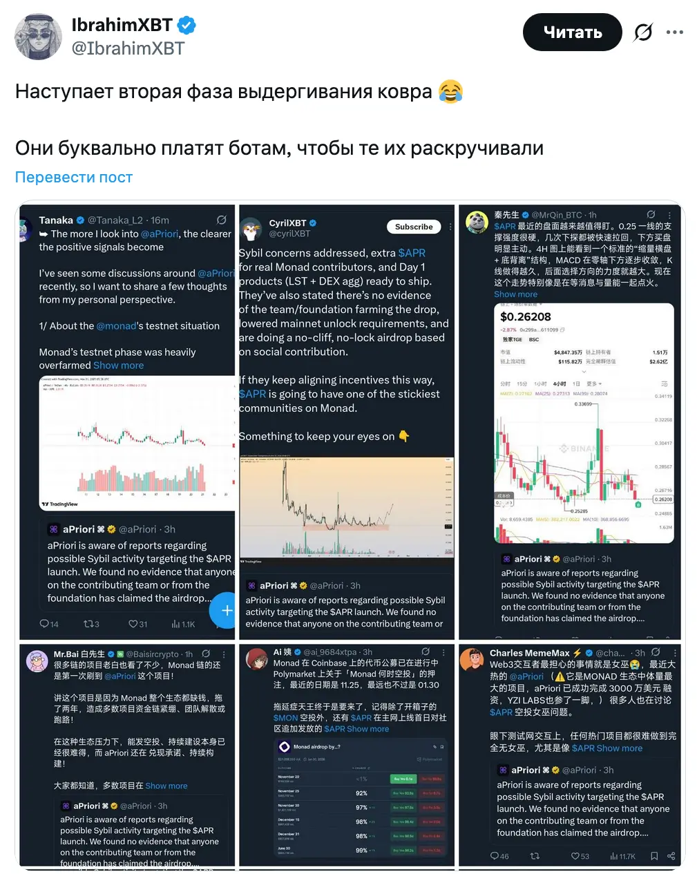 Другие пользователи поддержали команду aPriori, возложив вину на профессиональных сборщиков аирдропов.