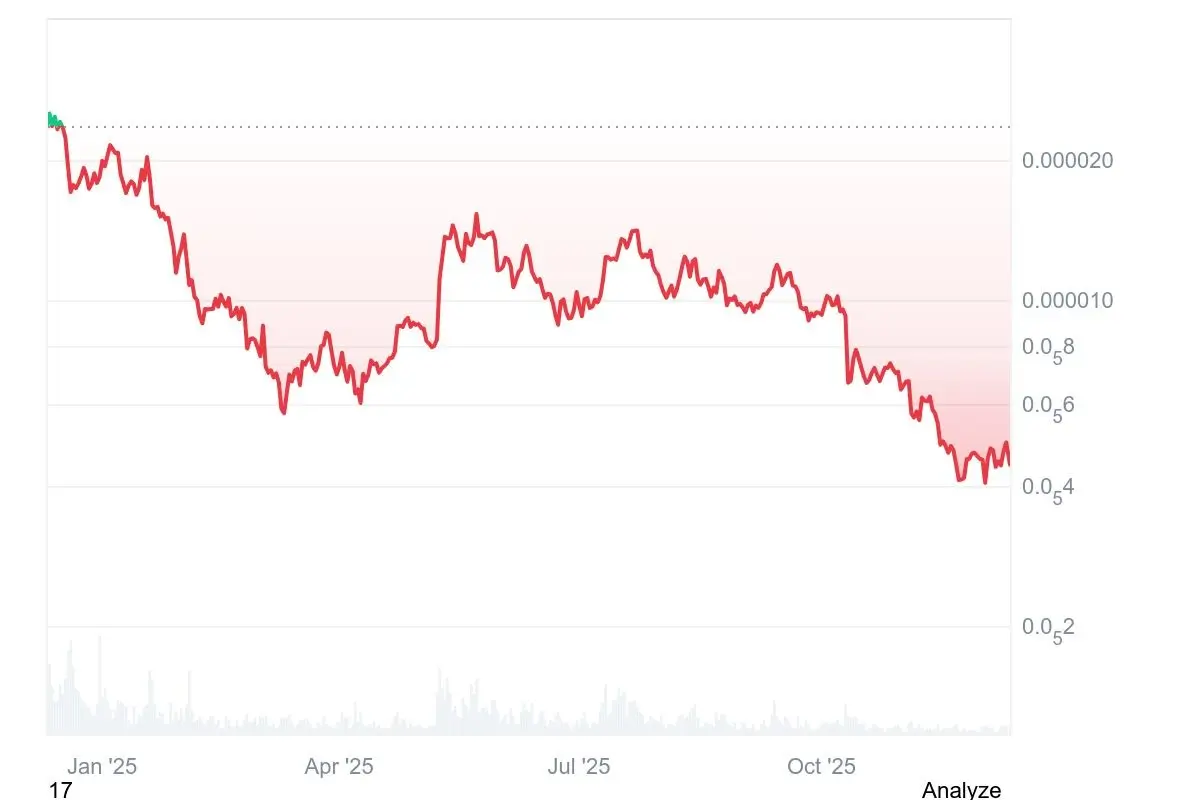 За последние 24 часа цена PEPE упала на 5,7%, а за год — более чем на 81%, свидетельствуют данные CoinMarketCap.