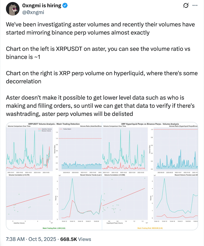 «Aster не позволяет получать данные более низкого уровня, например, о том, кто размещает и исполняет заказы, поэтому, пока мы не получим эти данные для проверки наличия фиктивной торговли, бессрочные контракты Aster будут исключены из листинга».