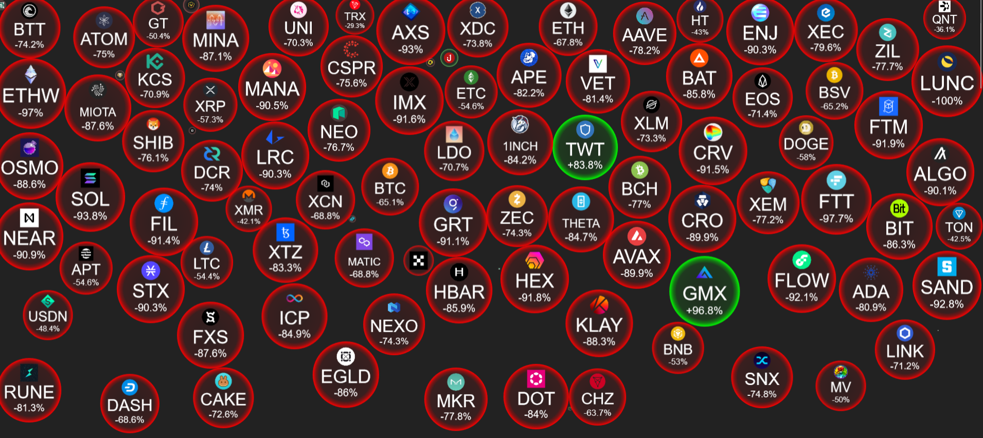 Глядя на 10 лучших активов с точки зрения рыночной капитализации согласно данным Crypto Bubbles, биткойн (BTC), Ethereum (ETH), Cardano (ADA) и Polygon (MATIC) потеряли значительно больше (65,1%, 67,8%, 80,9 и 68,8% соответственно) за последние 12 месяцев.