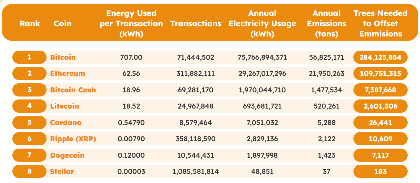 Ежегодные выбросы CO2 для ведущих криптовалют. Источник: Forex Suggest