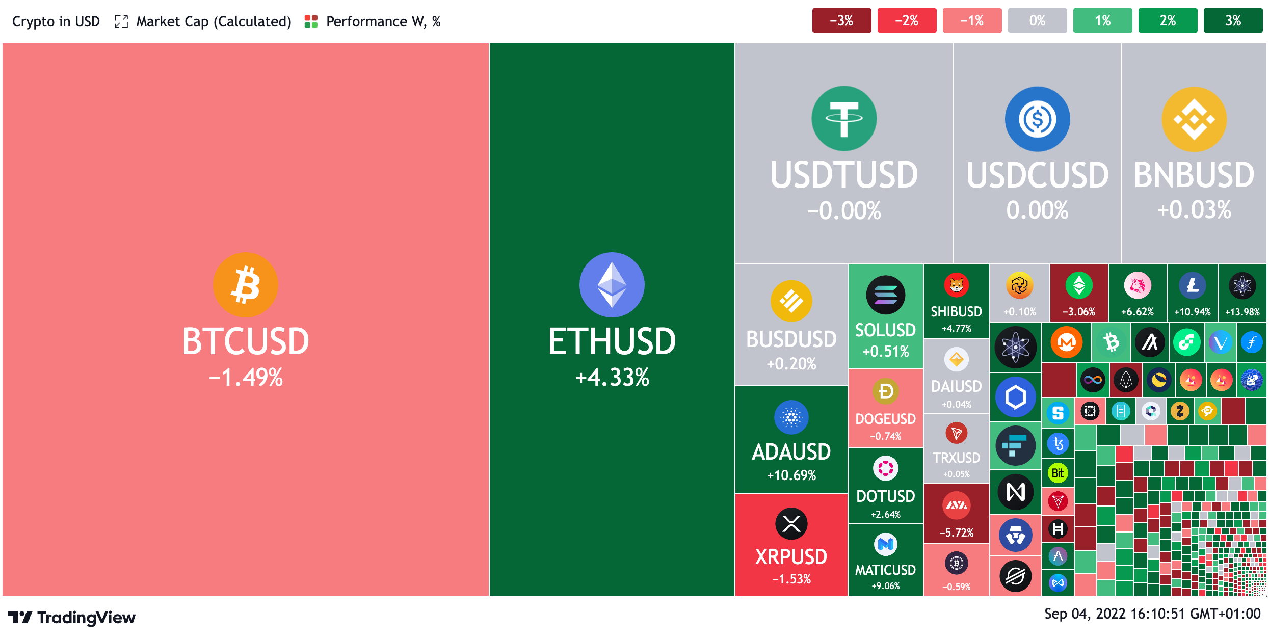 Биткойн до сих пор отставал в сентябре, снизившись на 1,49% до 19 704 долларов за последнюю неделю, потеряв прибыль, достигнутую в пятницу после данных о рабочих местах в США.