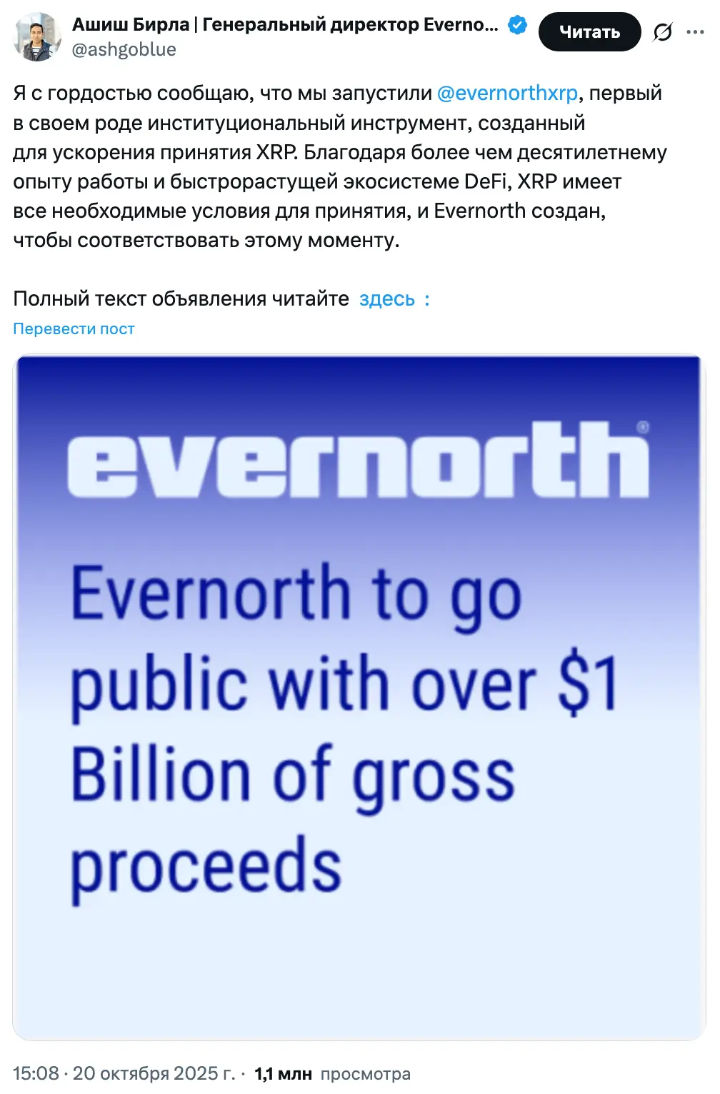 Генеральный директор Evernorth Ашиш Бирла заявил, что новый инвестиционный инструмент предназначен для ускорения внедрения XRP на фоне растущего интереса к децентрализованным финансам (DeFi). Он предложит инвесторам возможность доступа к XRP и связанным с ним стратегиям цифровых активов на публичном рынке.