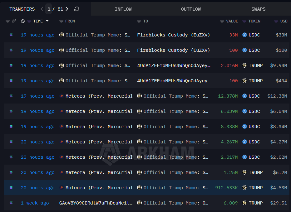 Данные платформы Arkham показывают: кошельки, ассоциируемые с командой Official Trump meme, в декабре вывели около $94 млн в USDC из пулов ликвидности TRUMP и направили средства на Coinbase.