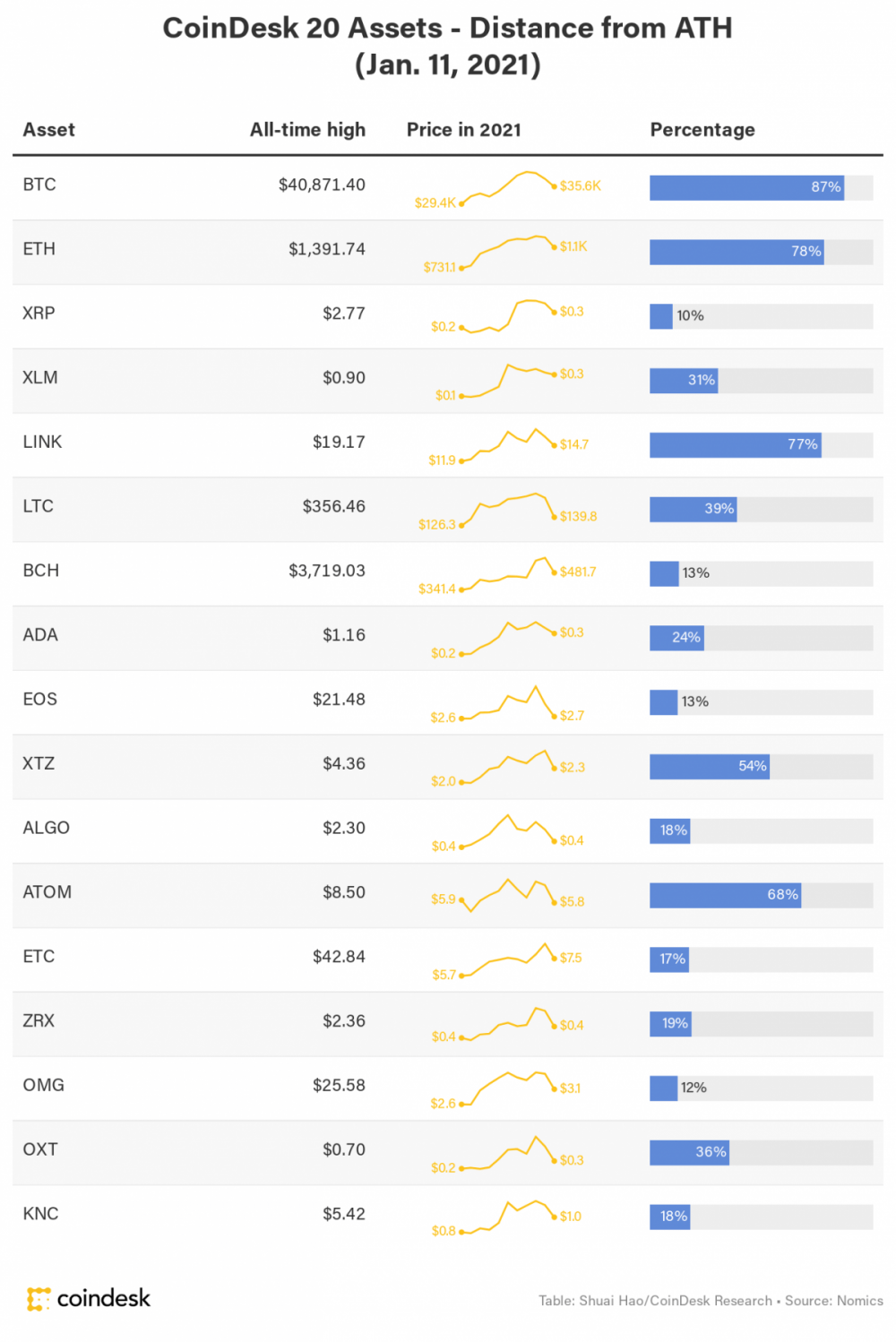 Данные, собранные CoinDesk Research, показывают, что по состоянию на 11 января цены как на биткойн (BTC), так и на Ethereum (ETH) составляли около 87% и 78% соответственно от своих рекордных максимумов. Тем не менее, цены на другие активы CoinDesk 20 все еще далеки от рекордно высоких цен. Одна из возможных причин состоит в том, что эти токены все еще могут иметь потенциал для достижения более высоких ценовых уровней на фоне последнего стремительного роста биткойнов.