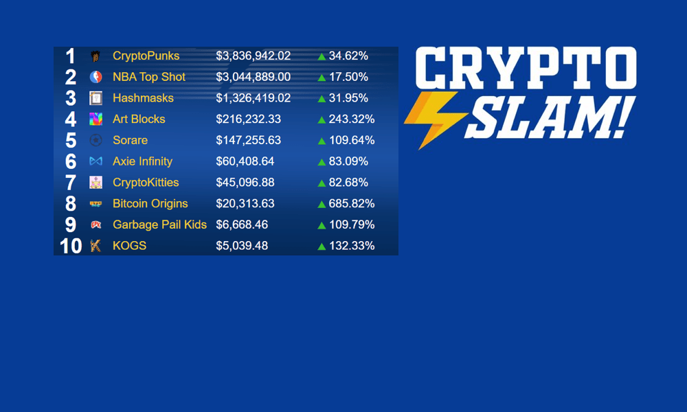 По статистике сайта CryptoSlam, собирающего информацию по платформам коллекционирования NFT, за последние 30 дней общий оборот предметов коллекционирования NFT превысил 100 миллионов долларов США. По данным аналитического портала, растет вся первая десятка платформ NFT.