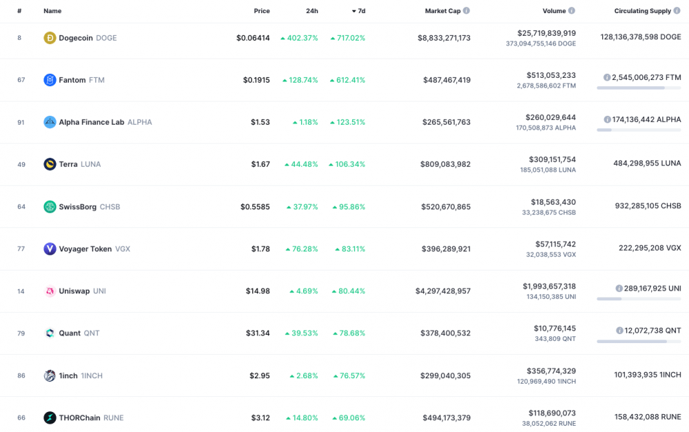 Последний скачок цен на DOGE напоминает резкий рост прошлым летом, поскольку видео на TikTok побуждали пользователей инвестировать в криптовалюту. А 3 января Анджела Уайт написала в Твиттере, что она была HODL-ером DOGE, что побудило многих из ее 1,3 миллиона подписчиков поднять цену на 203%. В целом периодичекие всплески спроса на DOGE подняли цену монеты пости на 1500% только за последний месяц, а за год рост составил баснословные 2700%. Таким образом DOGE вырвался в лидеры роста по показателям за неделю, месяц и год.