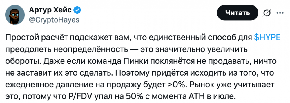 Сооснователь BitMEX Артур Хейс прямо предупредил, что предстоящая разблокировка создаст неизбежное давление продаж на токен. Он отметил, что заверения инсайдеров не могут устранить неопределенность.