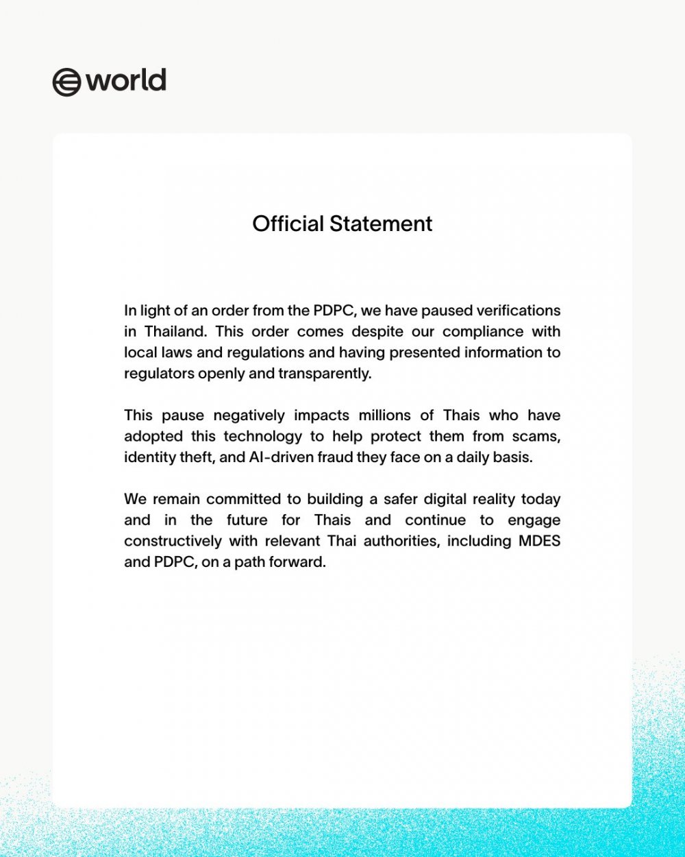 World Thailand подчеркнула: приостановка работы негативно скажется на миллионах тайских пользователей, которые применяли технологию цифровой идентификации для защиты от мошенничества, кражи личных данных и преступлений с использованием ИИ.