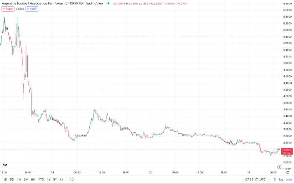 Токен болельщика Аргентинской футбольной ассоциации, предлагаемый в рамках партнерства с Socios, подскочил до 6,40 доллара 18 декабря, в день финала чемпионата мира по футболу, а затем упал на 58% до 2,67 доллара 20 декабря.