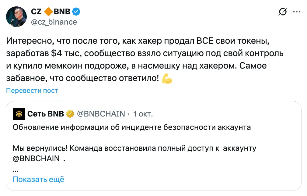 Эта активность последовала за сделкой, произошедшей ранее на этой неделе. Кошелек «0x872» заработал почти $2 млн прибыли в течение нескольких часов после инвестирования всего $3000 в токен «4». Трейдер получил 650-кратный доход после того, как Чжао 1 октября опубликовал пост о токене среди своих 8,9 млн подписчиков.